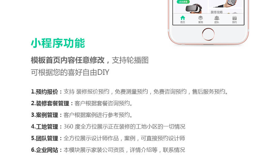 解决装修公司微信端快速传播营销的功能。公司设置,促销设置,小区设置,案例设置,团队设置,电话设置,可用VR展示,支持查看工地进度。